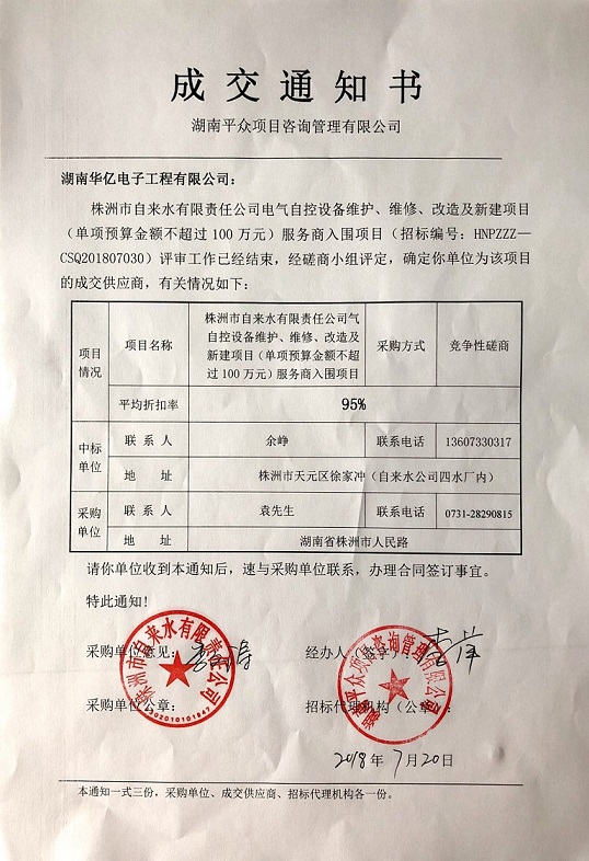 熱烈祝賀公司在“株洲市自來水有限責任公司電氣自控設備維護、維修、改造及新建項目服務商入圍項目”中標。希望大家在2018年下半年的工作中,勇攀高峰,取得更好的成績!