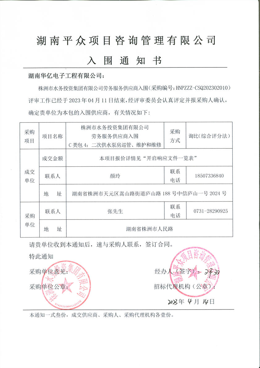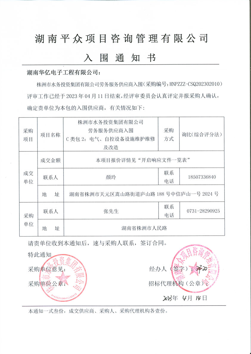 2023年4月14日公司成功入圍株洲市水務(wù)投資集團(tuán)有限公司電氣自控設(shè)備設(shè)施維護(hù)維修及改造以及二次供水泵房巡管、維護(hù)及維修的勞務(wù)服務(wù)供應(yīng)商。